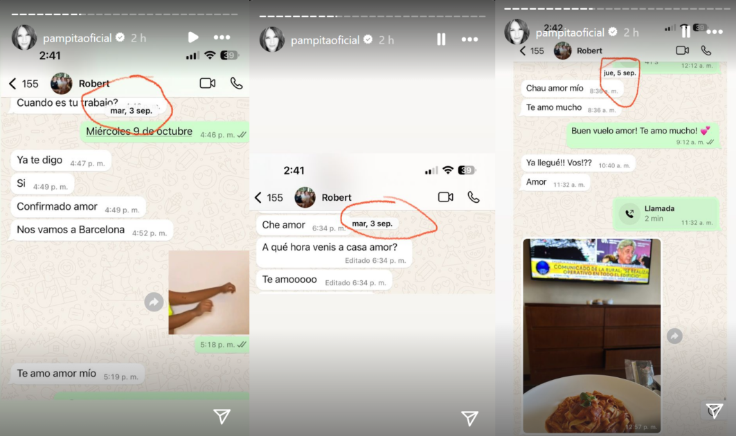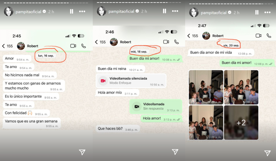En las capturas, que datan desde fines de agosto hasta el 20 de septiembre, se ve un intercambio de palabras cariñosas entre la pareja a través de WhatsApp, desmintiendo un tiempo de separación superior a una semana.