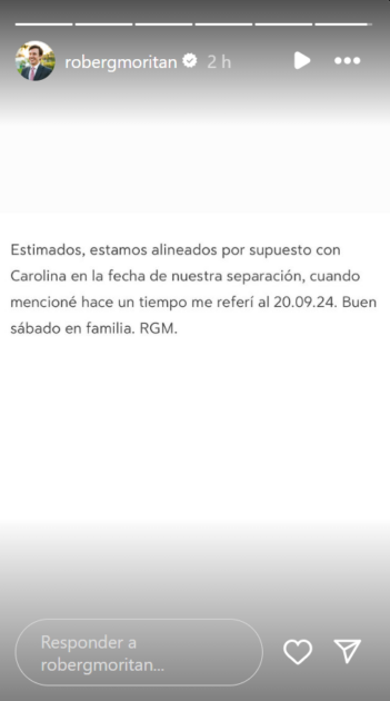 “Estimados, estamos alineados, por supuesto, con Carolina, en la fecha de nuestra separación. Cuando mencioné ‘hace un tiempo’ me referí al 20.09.24. Buen sábado en familia”.