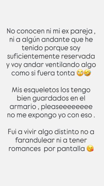 En otra publicación, la nueva participante de Mundos Opuestos añadió: “No conocen ni a mi expareja, ni a algún andante que he tenido porque soy lo suficientemente reservada”.