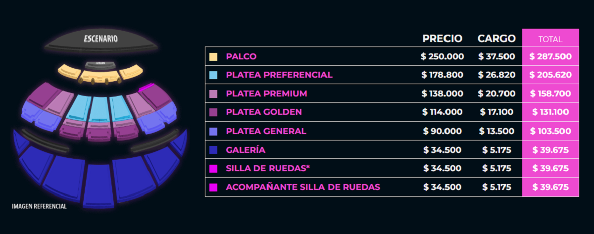Según informó la empresa, el precio de las localidades van desde los $39.675 a los $287.500, considerando el cargo por servicio, para cualquiera de las jornadas.