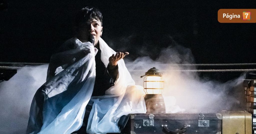 La actuación arrancó con JJ sentado entre maletas, cubierto por una sábana. Un barco de papel se le escapó de las manos, mientras detrás de él, un gran velero emergió mientras una tormenta estallaba, reflejando el caos interno ante un amor sin respuesta. Finalmente, destruyó el barco pequeño con rabia.