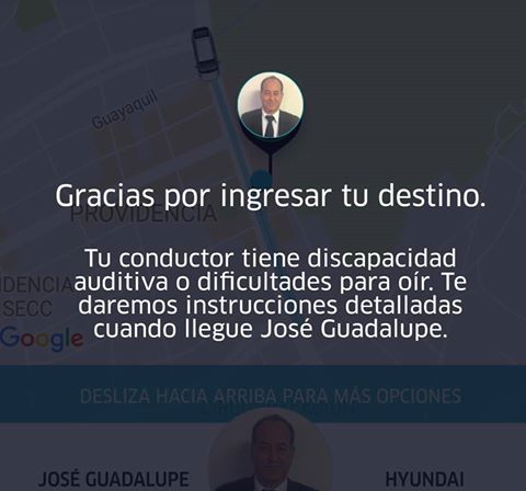 “Hola, les quiero compartir una historia que me pasó. El viernes por fortuna o por desgracia perdí las llaves de mi automóvil (los que me conocen saben que siempre me pasa) y justamente tenía una reunión a la cual tenía que acudir. No tenía otra opción que tomar Uber para llegar a tiempo, abrí la app y al momento me llegó la imagen que les comparto, en la cual me avisaba que una persona con discapacidad auditiva sería mi chófer en ese viaje, me daba la opción de cancelarlo pero decidí no hacerlo, me llegó curiosidad de saber qué me esperaba y de conocerlo.