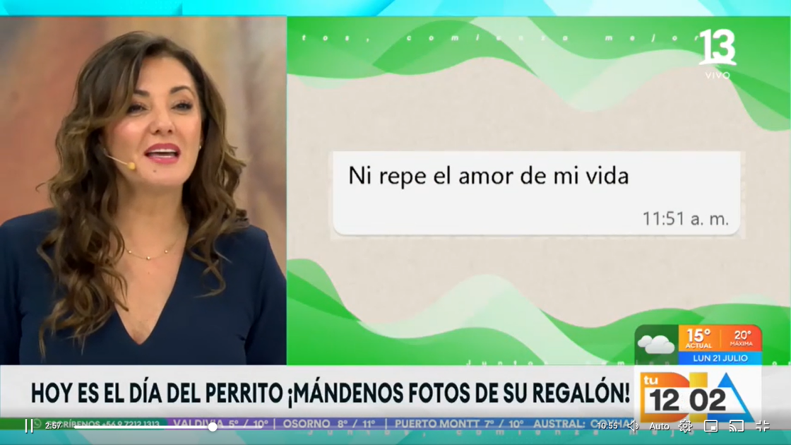 Luego de mensaje, en el matinal de Canal 13 se exhibió la imagen del famoso “Repe”: un simpático perrito con la lengua afuera. “¿Se llama Repe? ¿O eso entendí yo?”, preguntó la conductora del programa.