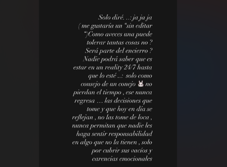 “Solo diré: ‘Ja ja ja’. Me gustaría un ‘sin editar’ (…) ¿Cómo a veces una puede tolerar tantas cosas? ¿Será parte del encierro? Nadie podrá saber qué es estar en un reality 24/7 hasta que lo esté”, planteó.
