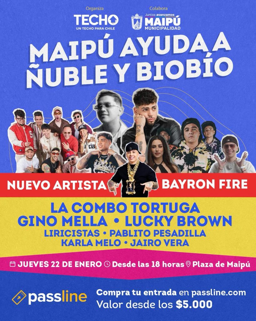 La actividad solidaria nace de una colaboración entre la Municipalidad de Maipú y Techo Chile, y contará con la participación de La Combo Tortuga, Karla Melo, Pablo Pesadilla, Gino Mella, Liricistas, Lucky Brown y Bayron Fire, quienes subirán al escenario para apoyar esta causa.