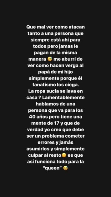 Javiera, por su parte, disparó en contra de Coté, señalando que “me aburrí de ver cómo hacen verga al papá de mi hijo simplemente porque el fanatismo los ciega. Lamentablemente, hablamos de una persona que va para los 40 años, pero tiene una mente de 17”.