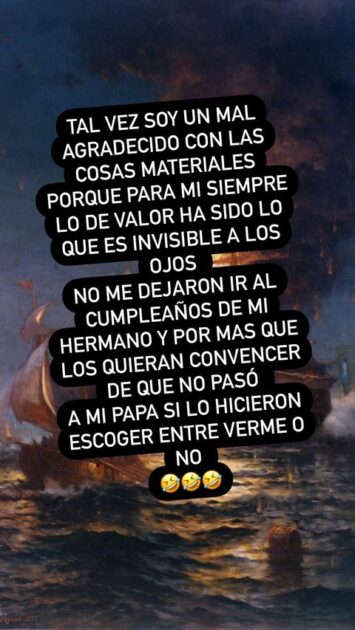 “Tal vez soy un mal agradecido con las cosas materiales, porque para mí siempre lo de valor ha sido lo que es invisible a los ojos” , comenzó escribiendo el joven en una historia.