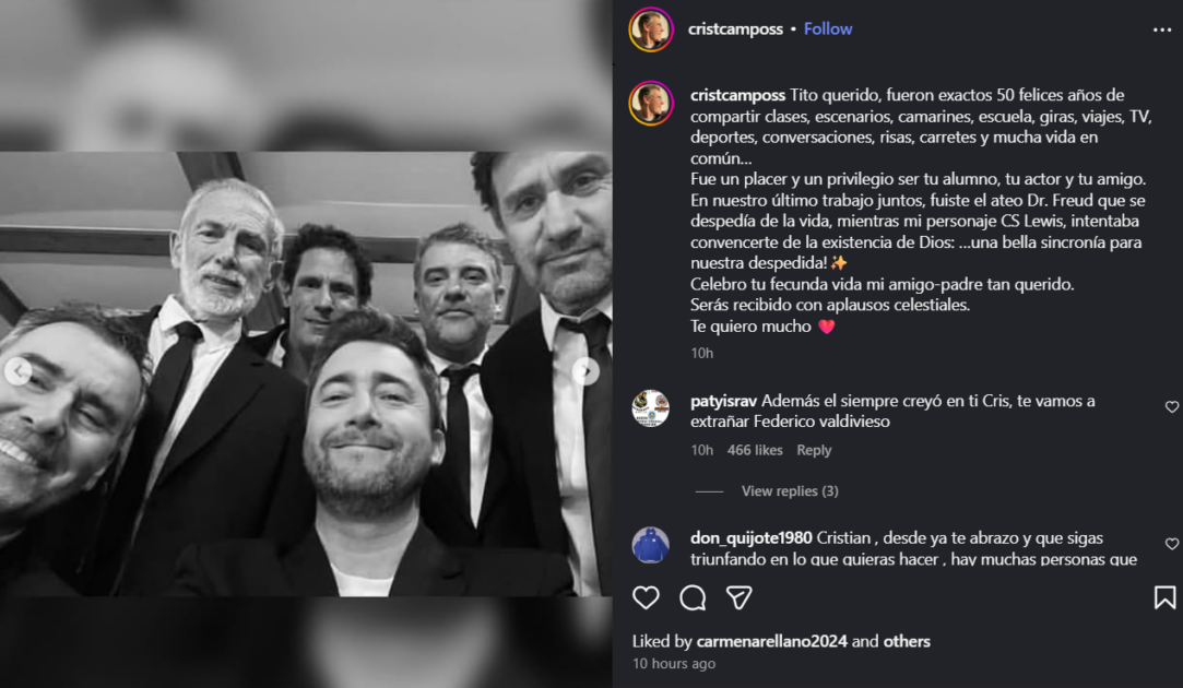 El primero en reaccionar fue Cristián Campos (Alonso Mercader), quien dedicó un extenso y profundo mensaje a su compañero.