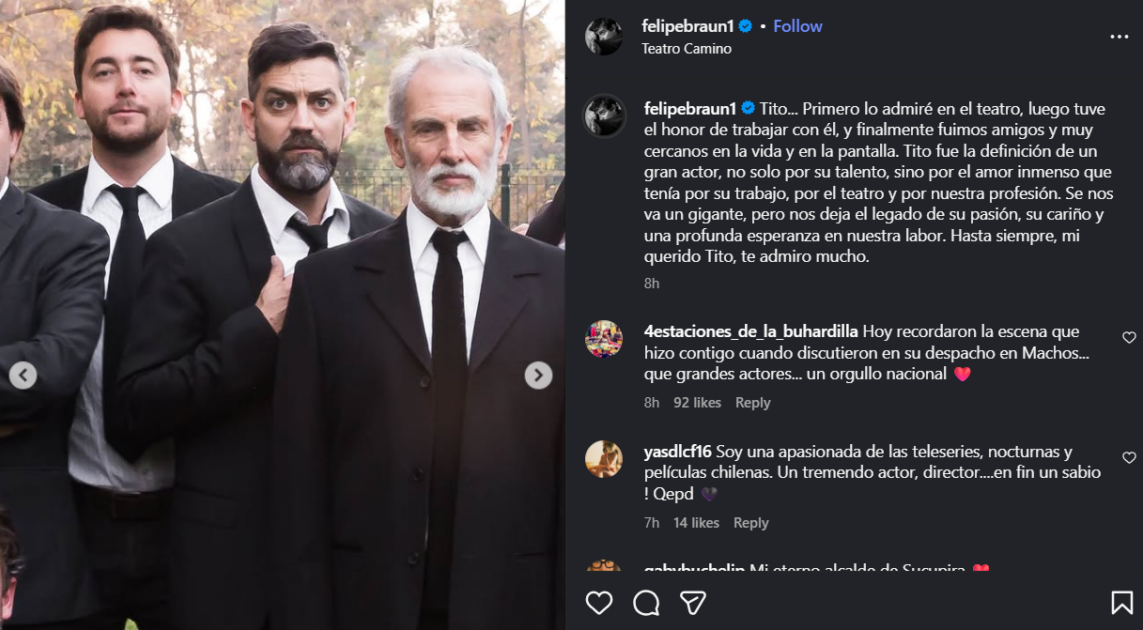 Más tarde escribió un texto más extenso, dando cuenta de su pesar: “Primero lo admiré en el teatro, luego tuve el honor de trabajar con él, y finalmente fuimos amigos y muy cercanos. Tito fue la definición de un gran actor… Se nos va un gigante, pero nos deja su pasión, su cariño y una profunda esperanza en nuestra labor”, expresó.