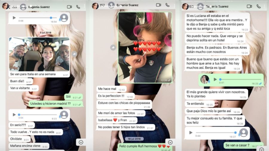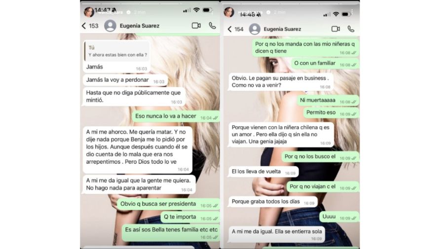 En tanto, según los mensajes, Suárez manifestó por aquel entonces que jamás iba a perdonar a Pampita “hasta que no diga públicamente que mintió” y contó: “A mí me ahorcó. Me quería matar. Y no dije nada porque Benja me lo pidió por lo hijos.