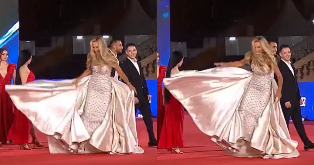Sin embargo, al hacer un segundo giro, sufrió un tropiezo que casi provoca su caída , pero logró sortearlo y continuar con su paso por la alfombra roja.