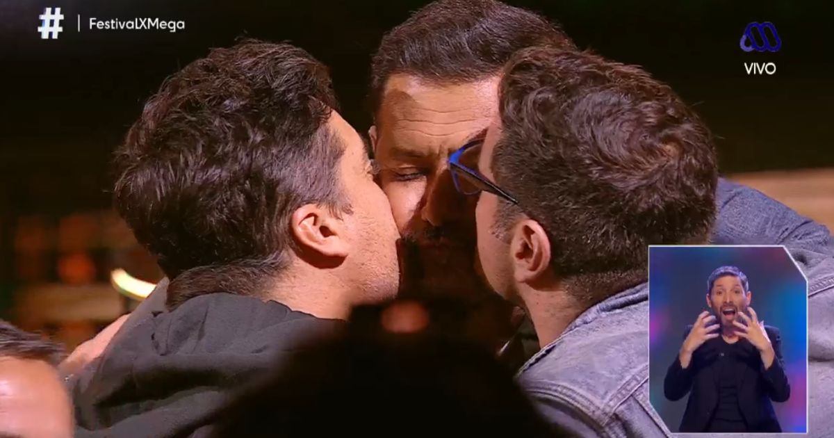 Tras la insistencia, Jorge y Pancho se acercaron al escenario, y Pedro Ruminot se agachó para, finalmente, darse un beso entre ellos.