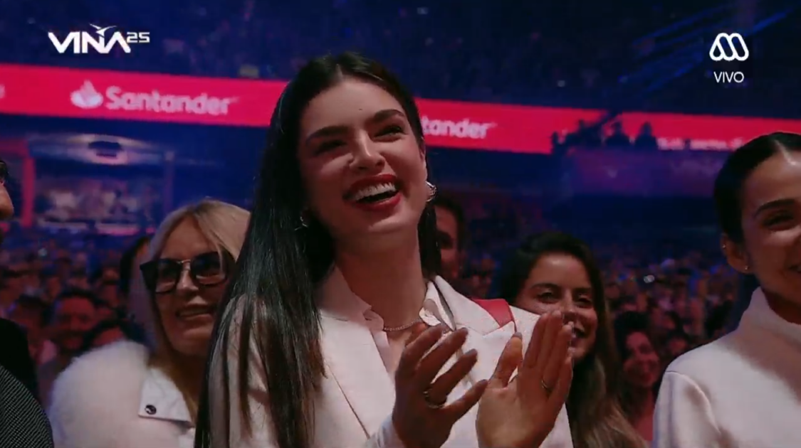 La modelo de 25 años formó parte del público de la primera noche del evento, asistencia que fue destacada por los animadores, Rafael Araneda y Karen Doggenweiler.