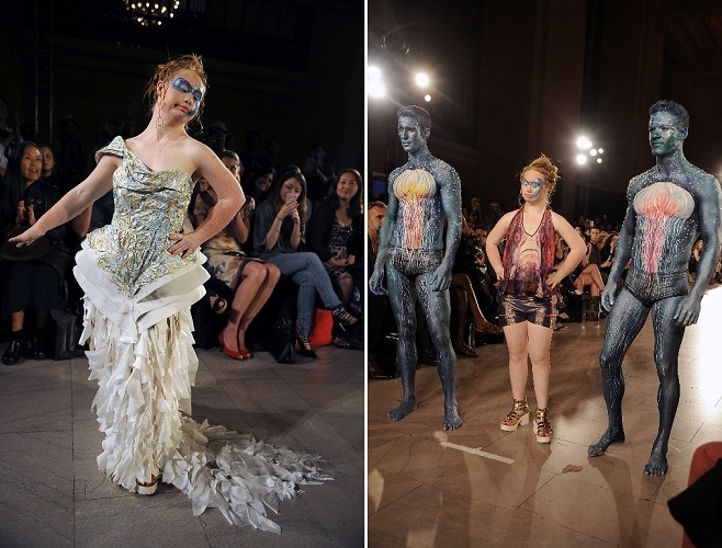 La australiana también conocida como “Maddy” no dejó que su válvula cardíaca ni su Síndrome de Down le impidieran llegar al estrellato y así lo demostró la noche del domingo, debutando con un vestido lleno de brillos y dos modelos con cuerpos pintados cogiéndola del brazo.