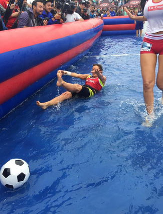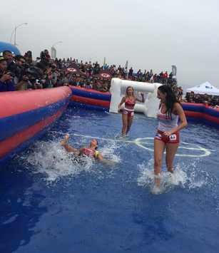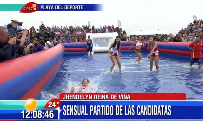 Las cuatro aspirantes se dividieron en equipos: el primero, conformado por Jhendely Núñez (Canal 13) y Flavia Fucenecco (UCV-TV) y el segundo, por Daniella Chávez (La Red) y Katherine Salosny (Mega). Vistiendo una simple polera y unos ajustados shorts, las candidatas se lanzaron con todo a la “cancha” llena de agua.