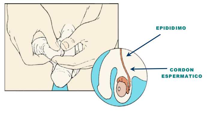 El epidídimo se extiende hacia arriba en dirección al cordón espermático. Aprieta delicadamente este cordón e intenta hallar algún bulto o protuberancia, en esa misma dirección.