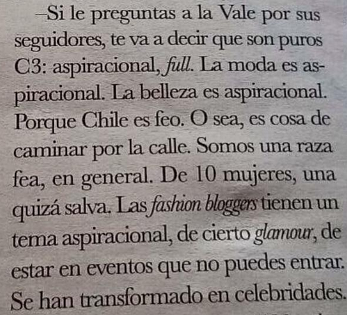 “O sea, es cosa de caminar por la calle. Somos una raza fea en general. De 10 mujeres, una quizás salva. Las fashion bloggers tienen un tema aspiracional, de cierto glamour, de estar en evento que no puedes entrar”, agregó para rematarla.
