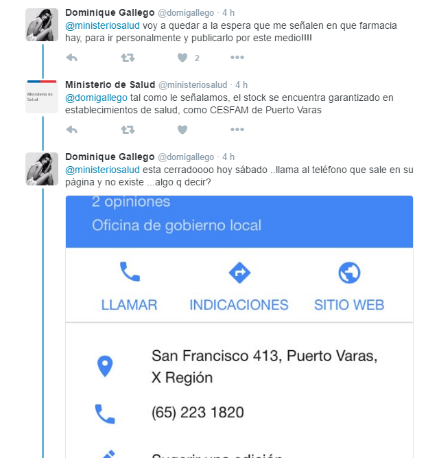 Precisamente la entidad gubernamental le respondió, indicándole que en la zona si está ese remedio y que se dirija al Centro de Salud Familiar (CESFAM) de Puerto Varas, pero nuevamente Gallego señaló que el centro asistencial está cerrado durante el sábado y que nadie contesta el teléfono de ningún recinto. Además en las farmacias le señalaron que hay “quiebre de stock” del medicamento.