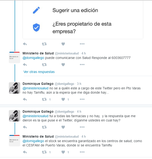 Pero las cosas para Dominique seguían de mal en peor, ya que uno de los remedios que debe tomar es Tamiflu, el que se encuentra agotado en Puerto Varas, lugar donde actualmente reside con su pareja. “No hay TAMIFLU en Pto Varas x quiebre d Stock a nivel nacional, que hacemos los q tenemos influenza H1N1 @ministeriosalud?” (sic) escribió en la red social del pajarito celeste.