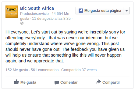 Ante la ola de reproches, la compañía tuvo que recurrir a las redes sociales para ofrecer disculpas a quienes se sintieron ofendidos, aceptando su error y asegurando que no se volverá a repetir.
