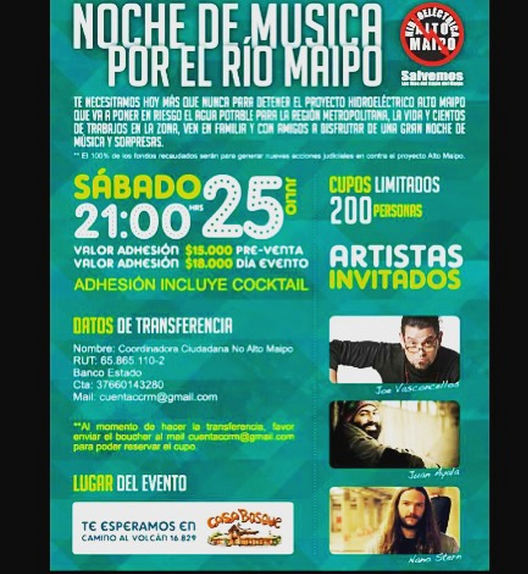 “Porque te necesitamos y juntos pararemos, el peor y más destructivo proyecto, q hay en Chile. Este sábado 25 a las 21 hrs en casa bosque tocarán a beneficio de la causa; Joe vasconcellos, Juan Ayala y NAno stern. Todos los datos y los precios aparecen en la foto q subí los esperamos, para seguir luchando por lo q es de todos y quebrarle la mano a la corrupción política en este país” (sic), escribió el ganador del relity Año 0.