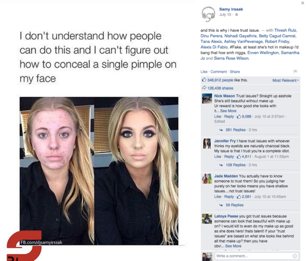 Lo peor de todo, fue cuando la recogió el DJ británico Samm Irssak, el cual escribió al lado: “Y por esto tengo problemas de confianza. Es una falsa. Al menos se ve sexy con maquillaje, me tiraría a esa perra, negro”, detalló en una publicación que fue compartida 125 mil veces.