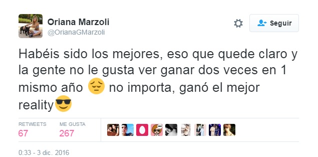 La venezolana Oriana Marzoli, tuiteó que la pareja compuesta por Luis y Angie había sido la mejor de la competencia, argumentando que a la gente no le gusta ver ganar dos veces en un mismo año a los rostros televisivos. Por otro lado, señaló que Luis había ganado el mejor reality, y eso valía mucho más.