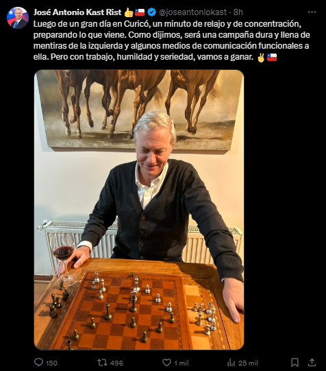 “Como dijimos, será una campaña dura y llena de mentiras de la izquierda y algunos medios de comunicación funcionales a ella. Pero con trabajo, humildad y seriedad, vamos a ganar”, escribió Kast en su publicación, acompañando el mensaje con una fotografía en la que aparece jugando ajedrez.