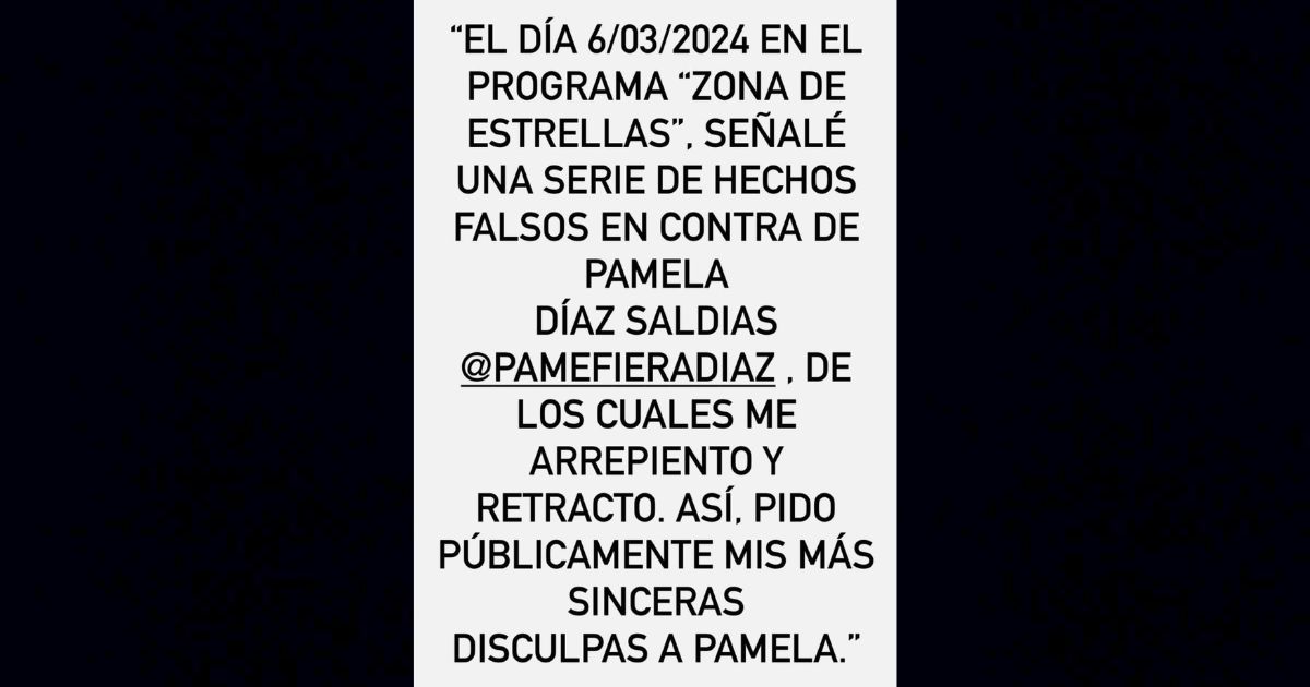 “El día 6/03/2024 en el programa Zona de Estrellas, señalé una serie de hechos falsos en contra de Pamela Díaz Saldías, de los cuales me arrepiento y me retracto”, dice el escrito.