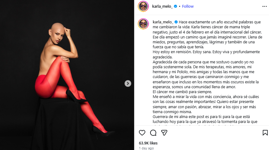 “Hace exactamente un año escuché palabras que me cambiaron la vida: ‘Karla, tienes cáncer de mama triple negativo’”, escribió.