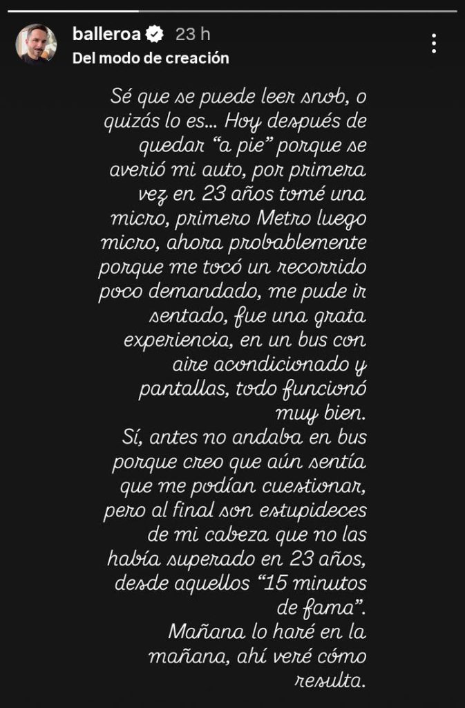 “Sé que puede leerse snob o quizás lo es… Pero hoy, tras quedar a pie porque se averió mi auto, por primera vez en 23 años tomé una micro: primero metro, luego micro”, confesó en una historia en su Instagram.