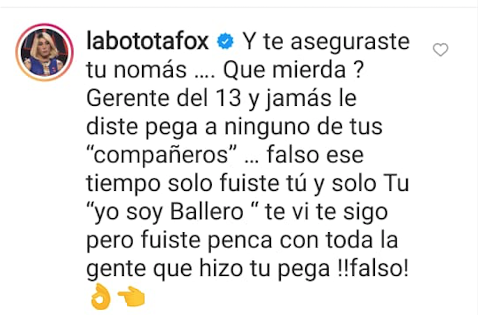 El post rápidamente acumuló más de 300 comentarios, uno de ellos de la Botota, quien se fue en picada contra el exchico reality. “Y te aseguraste tú no más. ¿Qué mierda? Gerente del 13 y jamás le diste pega a ninguno de tus ‘compañeros’”, indicó.
