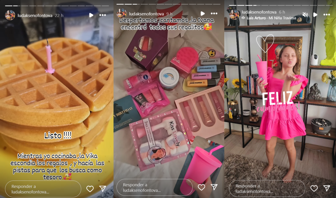 En tanto, en sus historias, Ludmila compartió la torta de waffles que cocinó para su pequeña y comentó su tradición de esconder los regalos por la casa.