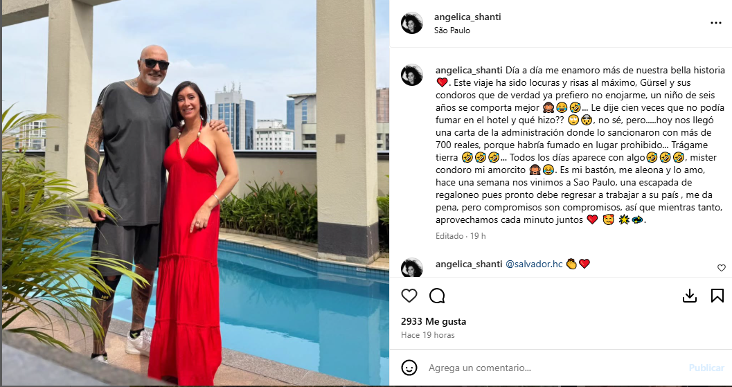 La exchica reality Angélica Sepúlveda volvió a sorprender en redes sociales, esta vez con una publicación llena de humor y amor desde Brasil, donde se encuentra disfrutando unos días junto a su novio turco, Gürsel.