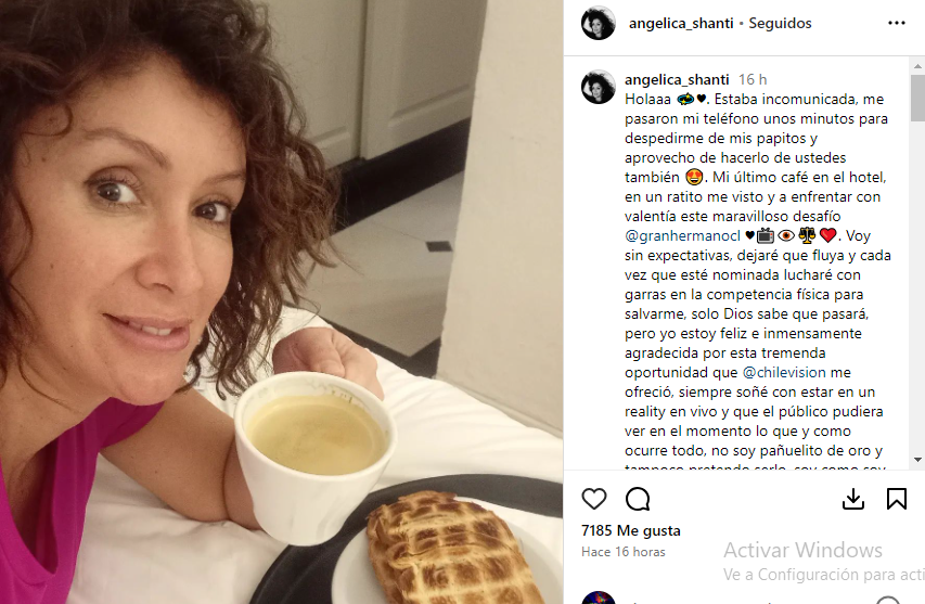 “Mi último café en el hotel, en un ratito me visto y a enfrentar con valentía este maravilloso desafío que es Gran Hermano. Voy sin expectativas, dejaré que fluya y cada vez que esté nominada lucharé con garras en la competencia física para salvarme, solo Dios sabe qué pasará, pero estoy feliz e inmensamente agradecida por esta tremenda oportunidad que Chilevisión me ofreció”, agregó.