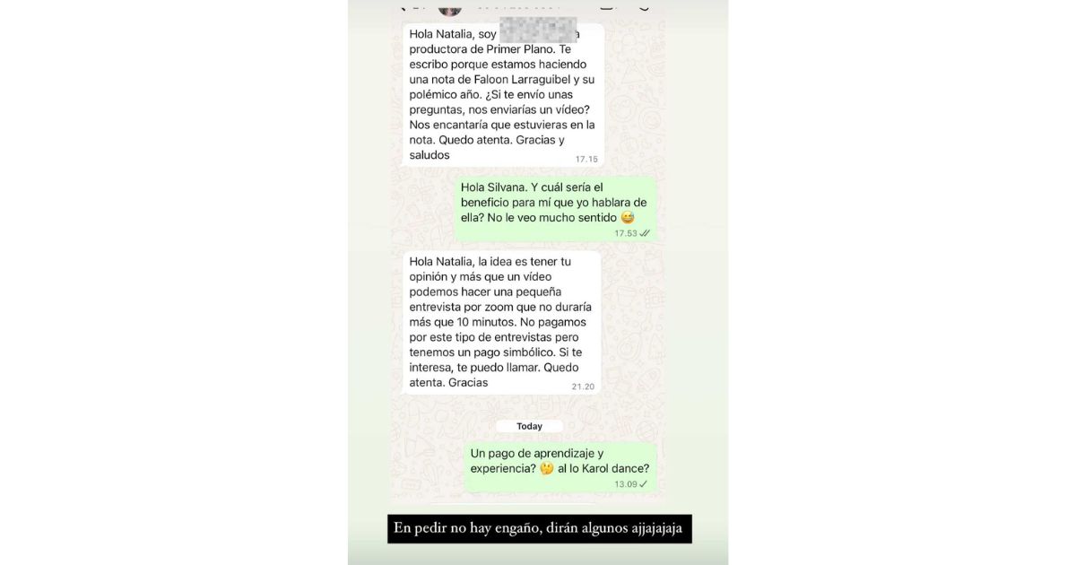 “Hola Natalia, soy productora de Primer Plano. Te escribo porque estamos haciendo una nota de Faloon Larraguibel y su polémico año. ¿Si te envío unas preguntas, nos enviarías un vídeo? Nos encantaría que estuvieras en la nota”, le ofrecieron.