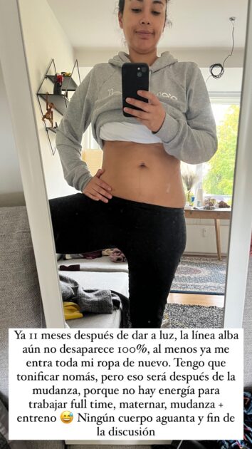 “Ya 11 meses después de dar a luz, la línea alba aún no desaparece 100%, al menos ya me entra toda mi ropa de nuevo”, indicó.
