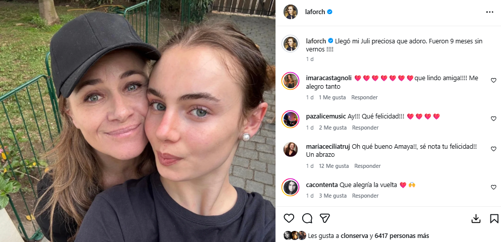 Así lo reveló la propia actriz en sus redes sociales. “Llegó mi Juli preciosa, que adoro. Fueron 9 meses sin vernos”, escribió la artista junto a una foto que evidenciaba el parecido que tiene con su primogénita.