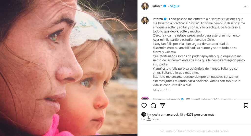 “La vida me estaba preparando para este gran momento. Mi hija partió a estudiar fuera de Chile. Estoy tan feliz por ella, tan segura de su capacidad de discernimiento, su amabilidad, su humor y sobre todo de su fuerza y valentía”, agregó.
