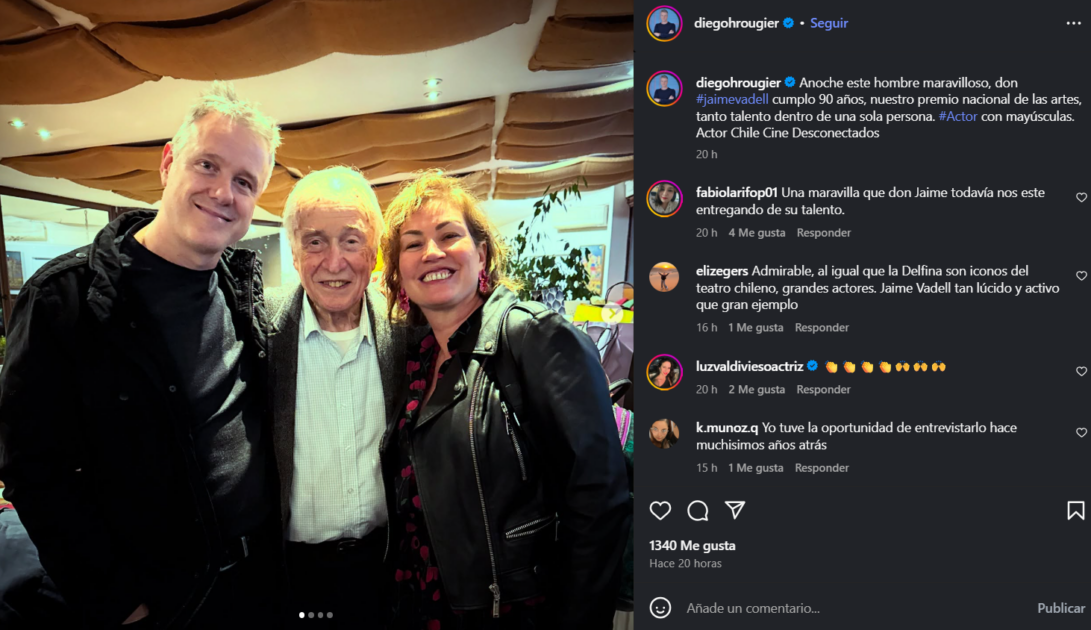 “Anoche este hombre maravilloso, don Jaime Vadell, cumplió 90 años. Nuestro Premio Nacional de las Artes, tanto talento dentro de una sola persona. Actor con mayúsculas”, destacó en su publicación de Instagram.