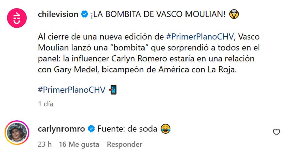 En la publicación que hizo el canal en su cuenta oficial de Instagram, la propia Carlyn aprovechó de reaccionar con el humor que la caracteriza.
