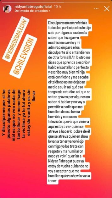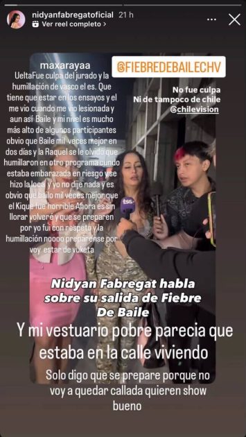 Finalmente, Nidyan Fabregat recalcó que volverá a Fiebre de Baile: “¿Querían que viniera? Aquí estoy… a ver quién se atreve. ¿Quieren show? Lo van a tener conmigo. Yo los traté con respeto y me humillaron ¿Querían a Nidyan Fabregat? Pues, estoy de vuelta. Cuidado. No voy a aceptar que me humillen”.