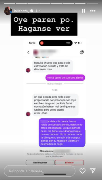 “Boquita chueca. ¿Qué pasa? ¿Estás estresada? Cuídate y trata de descansar más”, se lee en el mensaje. Siendo respondido inmediatamente por Belén: “No se opina de cuerpos ajenos”, sentenció.