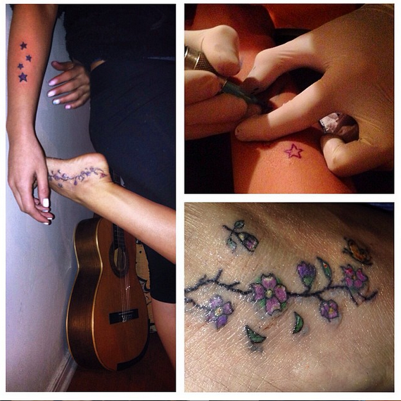 Delicadas flores violeta en la cara externa de su pie derecho y cuatro estrellas en su brazo, son las creaciones que el capo claudiogajardo.art dibujó en la piel de la ex Mundos Opuestos.