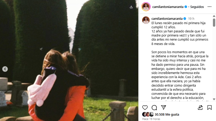 La ministra Camila Vallejo conmovió a sus seguidores al compartir una publicación en Instagram para celebrar el cumpleaños número 12 de su hija Adela.
