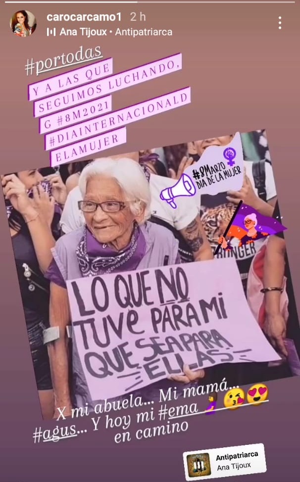 “Por todas las que seguimos luchando. Por mi abuela, mi mamá y hoy mi Ema”, escribió Cárcamo, dando así el nombre de la bebé junto a una fotografía donde se ve una persona mayor con un cartel en medio de una manifestación que dice: “Lo que no tuve para mí que sea para ellas”.