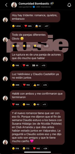 En esa misma línea, reveló que “la ruptura es de una pareja de actores que dio mucho qué hablar: Luz Valdivieso y Claudio Castellón ya no están juntos”.