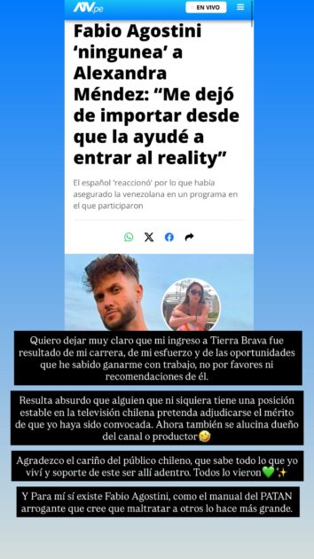 “Agradezco el cariño del público chileno, que sabe todo lo que yo viví y soporte de este ser allí adentro. Todos lo vieron y para mí sí existe Fabio Agostini, como el manual del patán arrogante que cree que maltratar a otros lo hace más grande”, cerró.