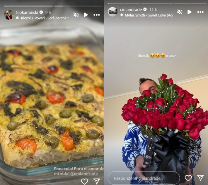 Mientras Camila publicó una foto de Francisco sosteniendo un ramo de rosas, el locutor de radial publicó una focaccia que preparó para su pareja.
