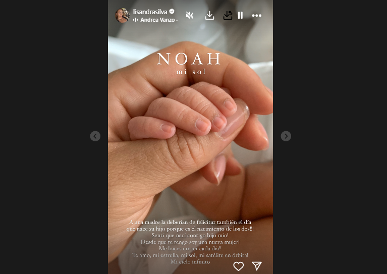 En otra fotografía, donde muestra una manito de Noah recién nacido, sostuvo que “desde que te tengo soy una nueva mujer. Me haces crecer cada día. Te amo mi estrella, mi sol, mi satélite en órbita, mi cielo infinito”.